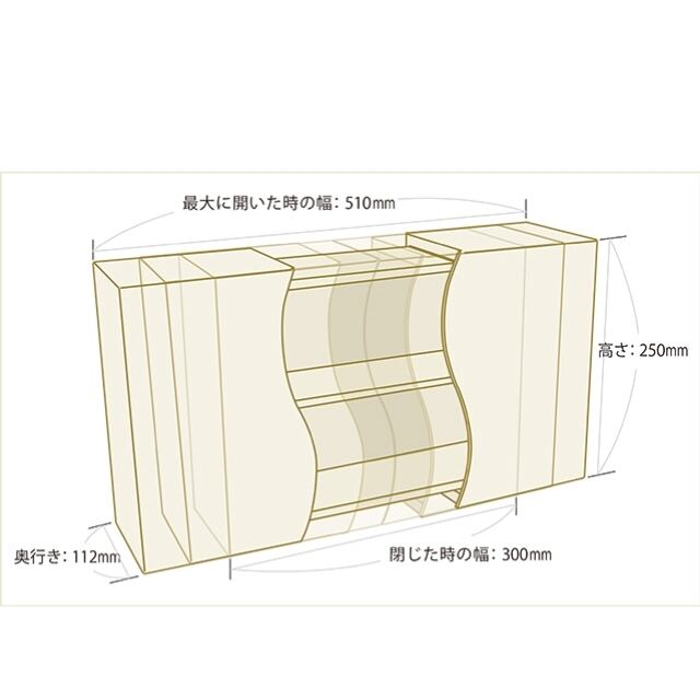 扉の開閉具合によって30~51㎝まで、自由な長さで置くことができます。また、棚板は中央と下部に取り付けることができるため、中に入れる物に合わせた使い分けが可能です。